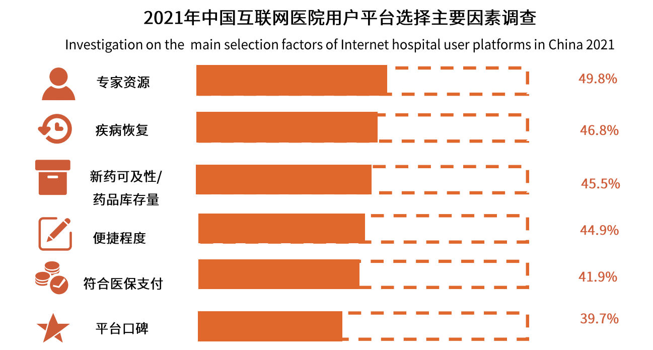 《报告》调研数据显示,互联网医院用户选择平台时,优先考虑的是平台所拥有的专家资源(49.8%)和疾病恢复效果(46.8%)。根据这一结果,分析师认为,患者对于互联网医院的第一诉求仍是治疗效果。不管是在线下还是线上,把病治好是患者最核心的诉求。