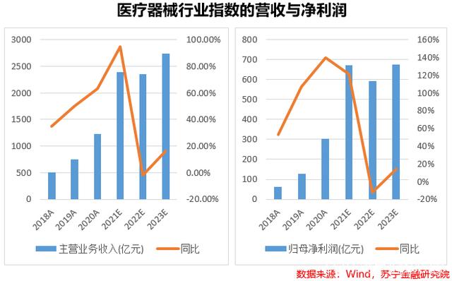 估值下降的背后是机构对于医疗器械未来盈利较为悲观的预期。从过去几年医疗器械行业指数的盈利表现看,受到疫情对于医疗器械需求的爆发式增长,行业整体无论是收入还是净利润都取得了年均40%以上的增长。但在高基数的影响,以及未来疫情影响消退的预期下,机构对于未来的增长一致预期比较悲观。