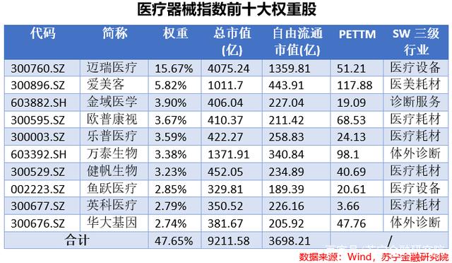 从医疗器械的权重股来看,迈瑞医疗作为A股中医疗设备的绝对龙头,在指数中的权重占比较大,除迈瑞医疗之外的前十大权重成分股,整体权重比较分散,前十大权重股占比不足50%。